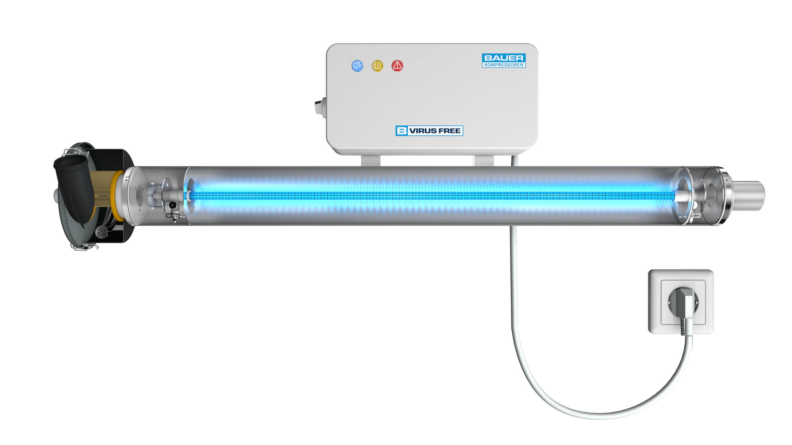 Bauer B-Virus Free är ett högeffektivt filter som med hjälp av en speciell UVC-ljuskälla, kan eliminera upp till 99,9% av viruset Covid 19 samt även andra virus, bakterier, pollen och mögelsporer.